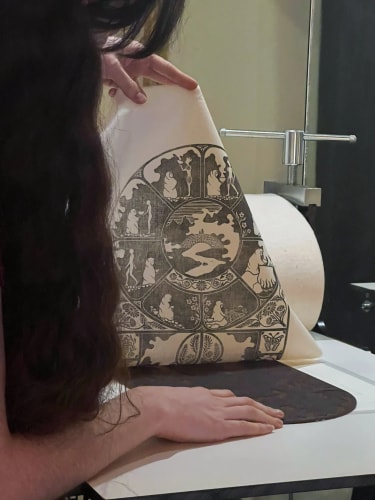 resse : outil permettant de presser la matrice encrée sur un support pour réaliser une impression.
