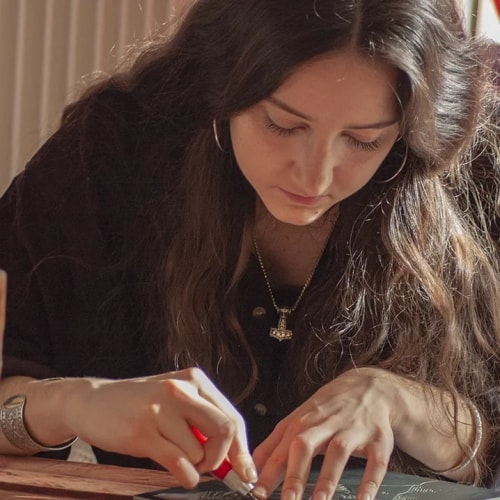 Graphiste de formation et illustratrice en freelance, j'exerce ces métiers par un biais artisanal. Passionnée d’arts décoratifs et de fait-main, la gravure est devenu mon médium d’expression principal. Sur mes objets imprimés, se dessinent des ornements et des paysages oniriques inspirés de la nature et des mythologies.